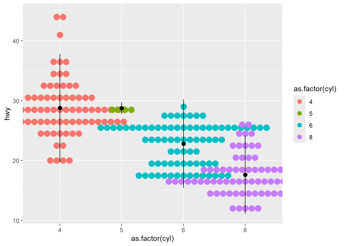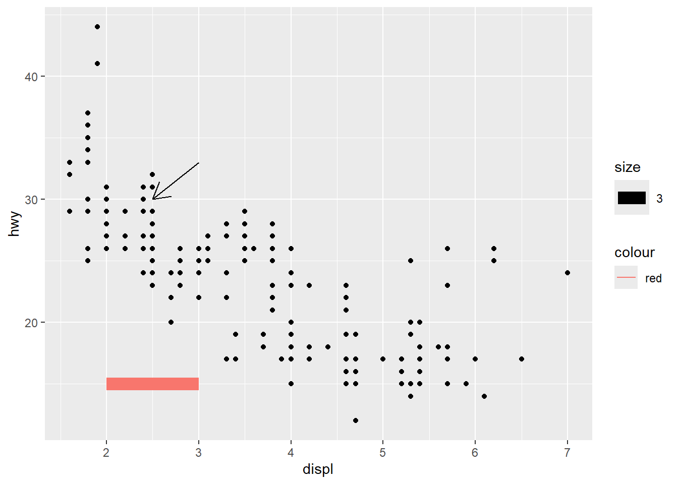 stat_summary(aes( x = class,y = hwy), geom="point",color="red",size=4)## No summary function supplied, defaulting to
