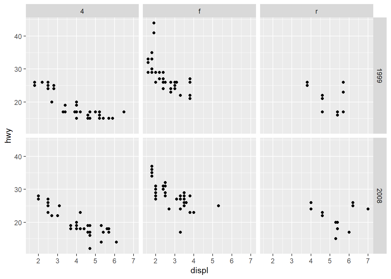 Facetting by both year and drive type in one call.