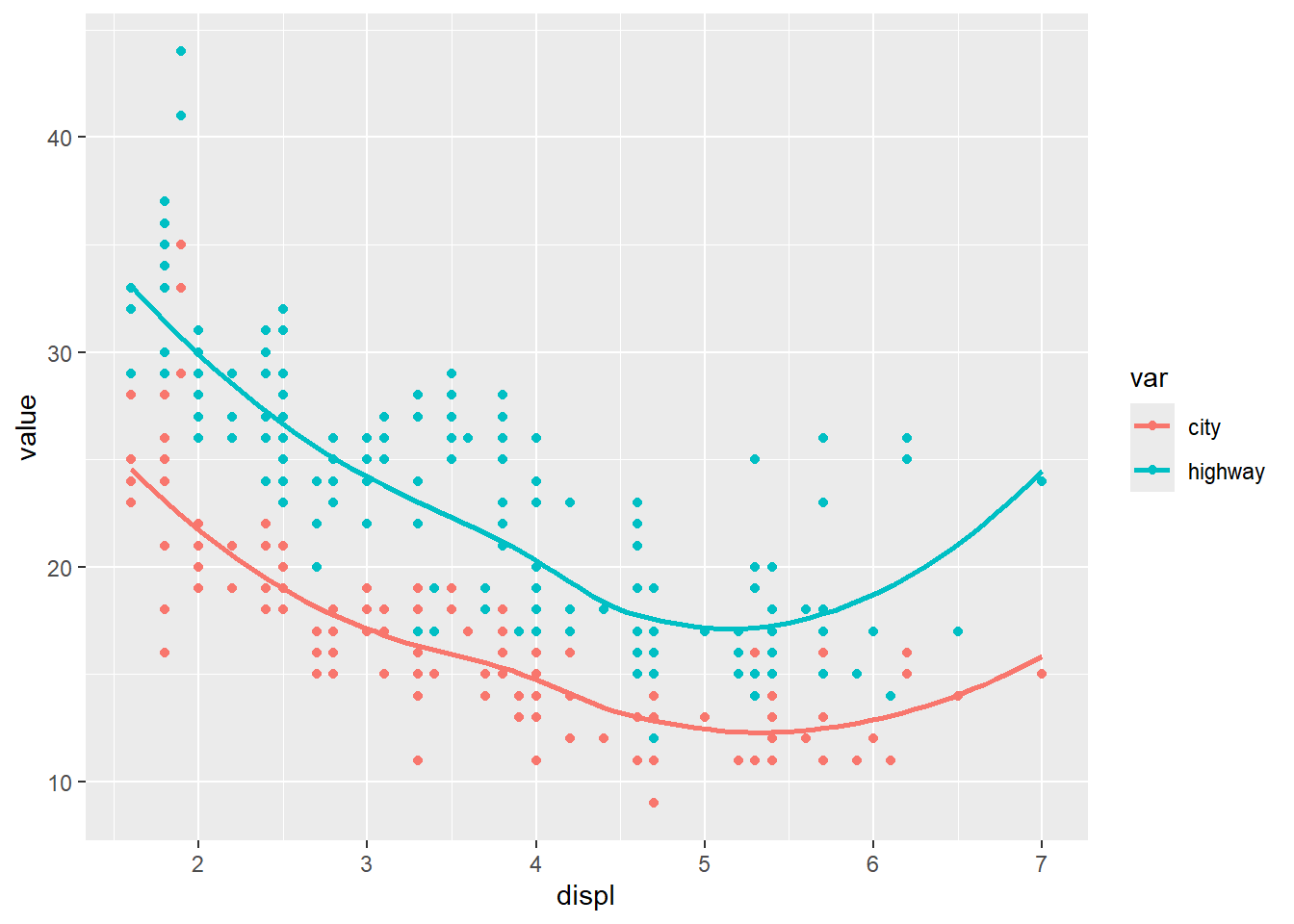 geom_smooth(aes(color = var), se = F)## `geom_smooth()` using method = 'loess' and formula =