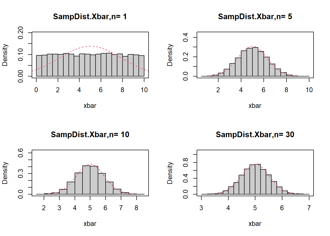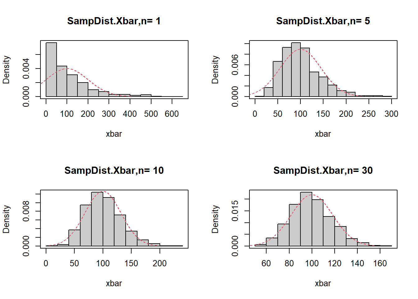 hist(xbar,prob=T,main=paste('SampDist.Xbar,n=',n),col=gray(.8))
