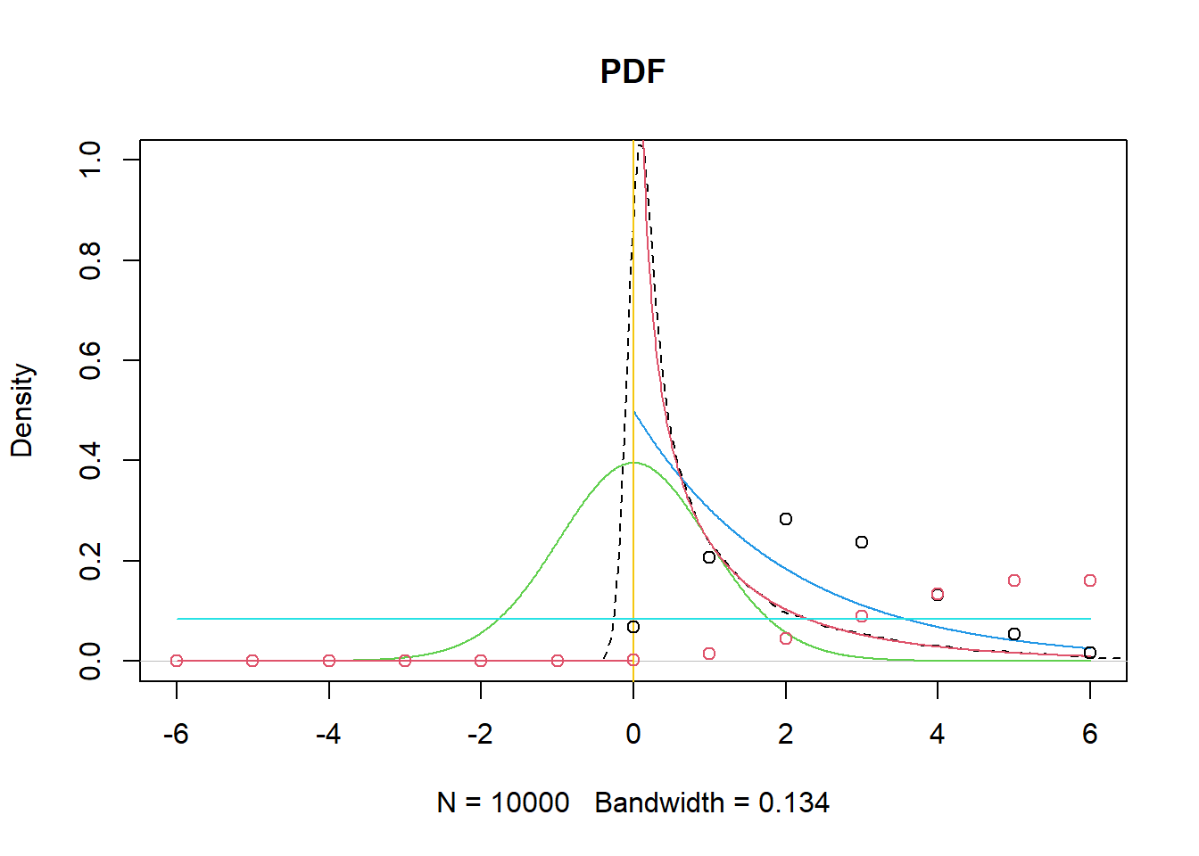 plot(density(rt(10000,n)^2),main="PDF",ylim=c(0,1),lty=2,xlim=c(-6,6)) #simulation